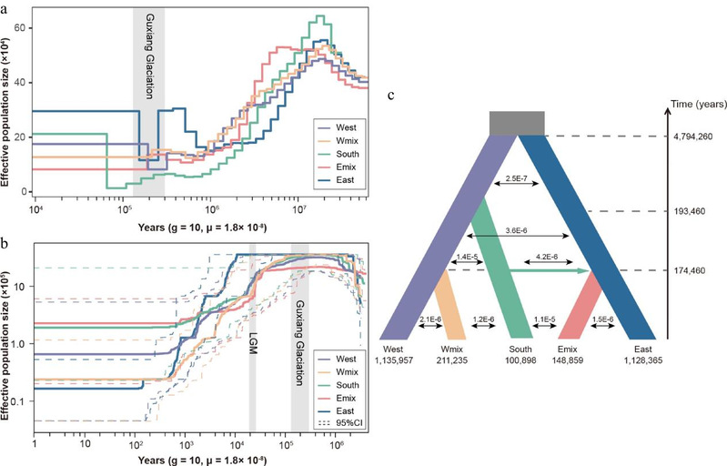 Figure 2. Demographic history of three lineages and two admixed groups in Davidia involucrata