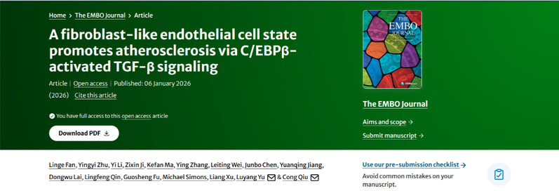 2026年1月6日,浙江大学生命科学学院遗传与再生生物学研究所余路阳/裘聪团队在EMBO Journal杂志在线发表题为“A fibroblast-like endothelial cell state promotes atherosclerosis via C/EBPβ-activated TGF-β signaling”的研究论文。该研究报道了在动脉粥样硬化中存在的一群独特的促血管炎症的成纤维样内皮细胞的分子特征,并揭示了调控此类内皮细胞病理表型的分子机制,为动脉粥样硬化的治疗提供新靶点。